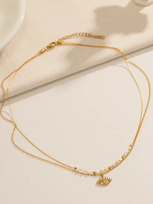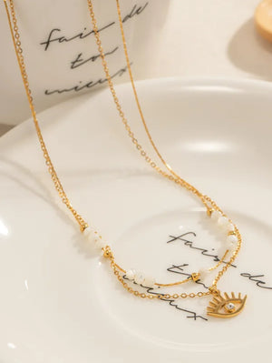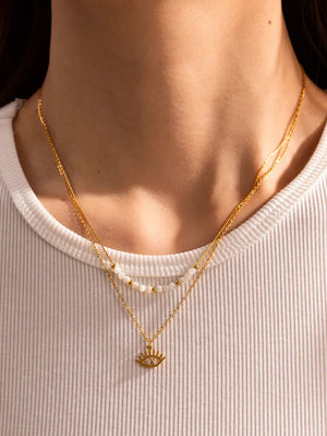 Изработено от висококачествена неръждаема стомана 304 (медицинска стомана) с лъскав златен цвят, това бижу комбинира стил и издръжливост. Късата верижка (39 см) е украсена с красиви бели перли и златни акценти, докато дългата верижка (41 см) завършва с очарователен амулет в формата на око, инкрустиран с циркон, който добавя мистериозен чар. Дизайнът му е лек и универсален, подходящ както за ежедневна употреба, така и за специални събития.