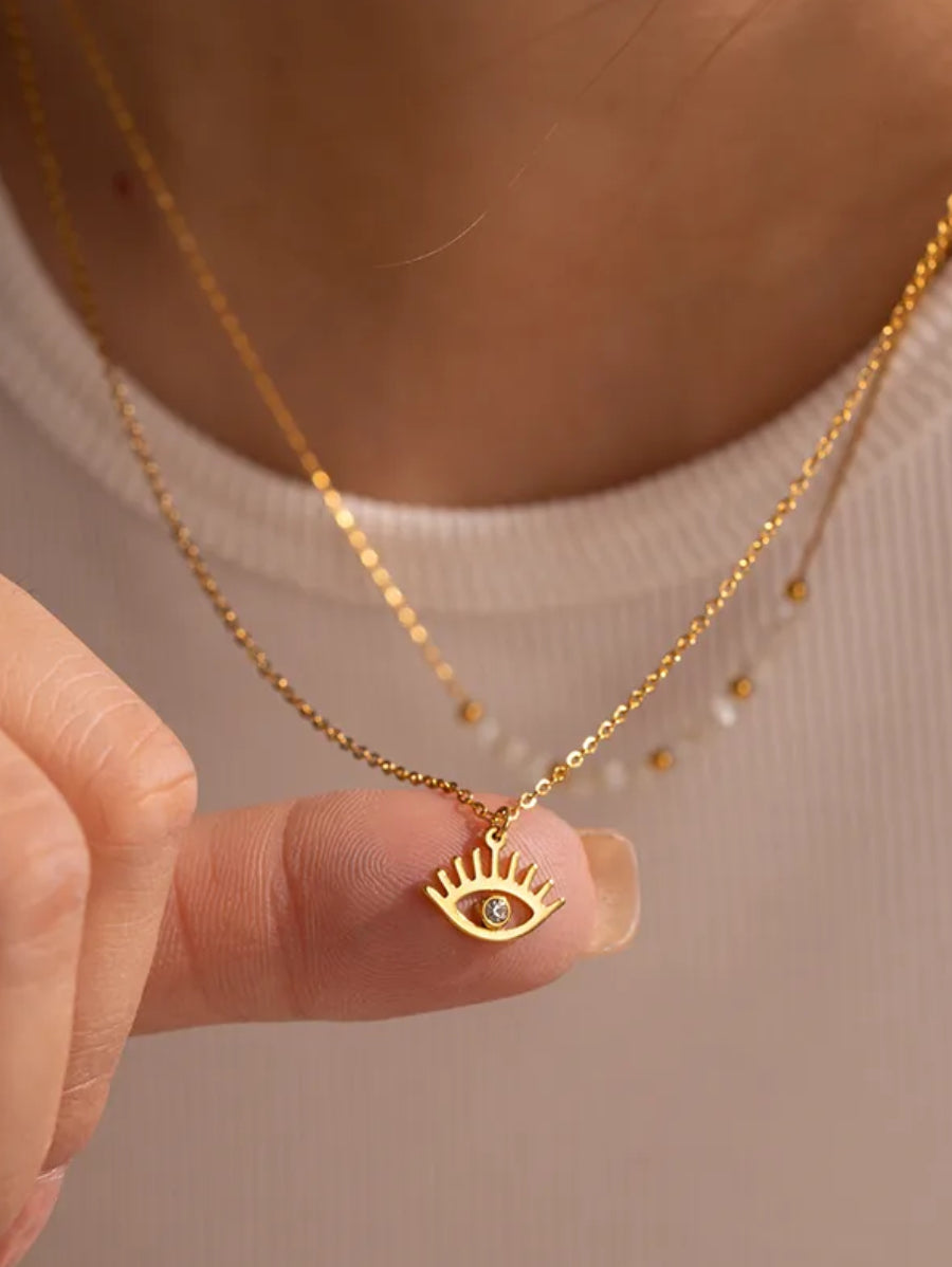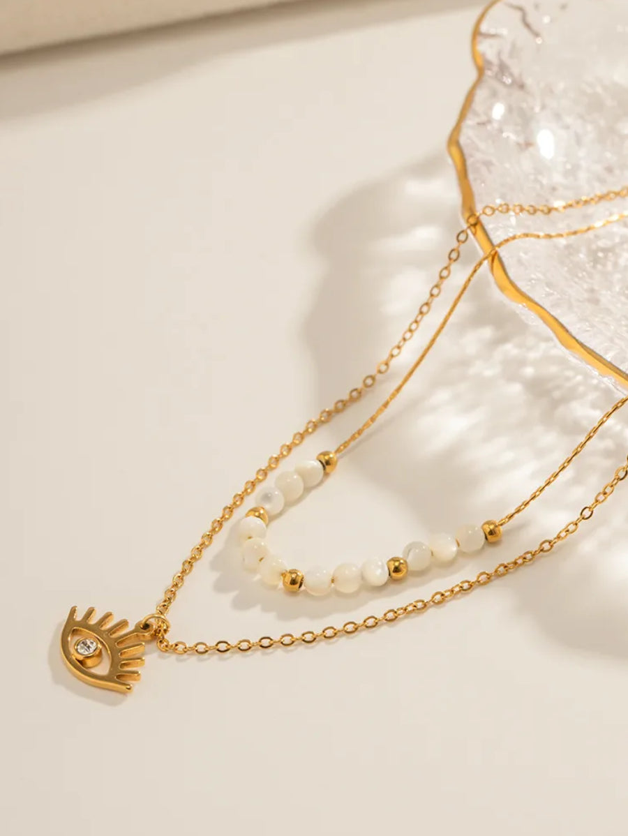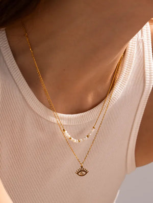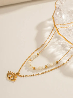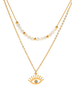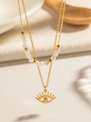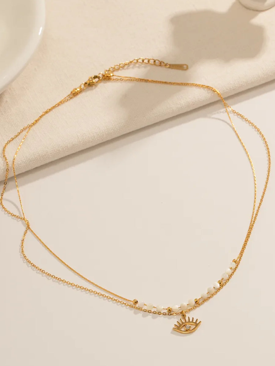 Изработено от висококачествена неръждаема стомана 304 (медицинска стомана) с лъскав златен цвят, това бижу комбинира стил и издръжливост. Късата верижка (39 см) е украсена с красиви бели перли и златни акценти, докато дългата верижка (41 см) завършва с очарователен амулет в формата на око, инкрустиран с циркон, който добавя мистериозен чар. Дизайнът му е лек и универсален, подходящ както за ежедневна употреба, така и за специални събития.