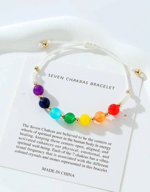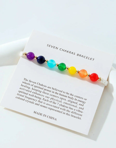 Смята се, че седемте чакри са центровете или колелата на духовната сила в човешкото тяло. При енергийното лечение поддържането на тези центрове отворени, подравнени и активирани подобрява нашето физическо, емоционално и духовно благополучие. Всяка от 7-те чакри има вибрационна честота, която е свързана с различните цветни кристали и камъни, представени в тази гривна.