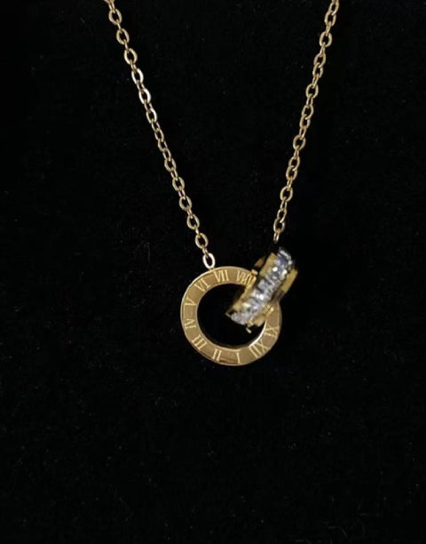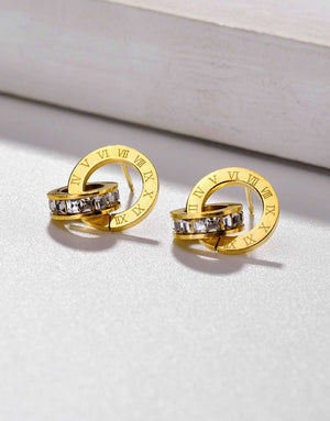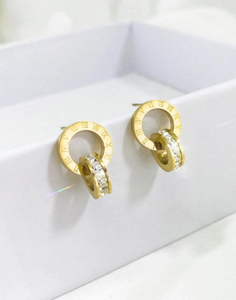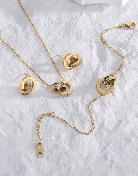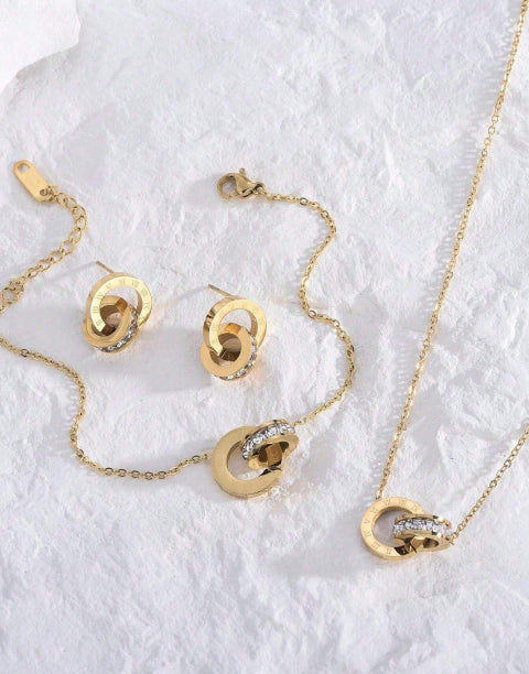 Този комплект бижута от медицинска стомана 316L е идеален подарък за всяка дама. Създадени с внимание към детайла, обеците, колието и обеците от комплекта, са инкрустирани с блестящи бели кристали, а по периферията си са гравирани с римски цифри, които допринасят за елегантния и изискан вид. Този комплект бижута е подходящ както за специални поводи, така и за ежедневно носене, като допълнителен акцент към вашия стил.