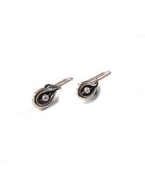 Елегантни дамски обеци, изработени от сребро с проба 925 и синтетични бели перли. Сребърните обеци се изработват ръчно и са със закопчалка тип рибарска кука. Времето за изработка е около 5 работни дни.